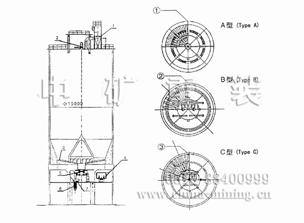水泥儲存庫是在庫底中心位置設一錐形混合室,以降低庫內(nèi)的卸料壓力,消除漏斗流?;旌鲜?設8~12個進料孔,在混合室和庫壁之間的環(huán)形區(qū)設有8~12個充氣區(qū),卸料時輪流向相對的環(huán)形小 區(qū)充氣,使部分水泥流向中心混合室。在自上而下的流動過程中,切割水平料層而產(chǎn)生重力混合作 用,進入混合室后又因混合室內(nèi)的連續(xù)充氣攪拌而進一步均化。這種庫的均化值可達5~9。電耗 0.15~0. 30kwh / t.
