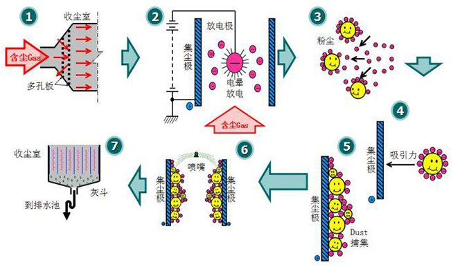 金屬放電線在直流高電壓的作用下①,將其周圍氣體電離②,使粉塵或霧滴粒子表面荷電③,荷電粒子在電場力的作用下向收塵極運(yùn)動(dòng)④,并沉積在收塵極上⑤,水流從集塵板頂端流下,在集塵板上形成一層均勻穩(wěn)定的水膜⑥,將板上的顆粒帶走⑦。因此,濕式電除塵器與干式ESP的除塵原理基本相同,都要經(jīng)歷荷電、收集和清灰三個(gè)階段,區(qū)別在于清灰方式的不同,濕式電除塵器采用液體沖刷集塵極表面來進(jìn)行清灰。其工作原理如圖1。