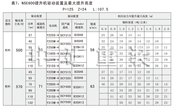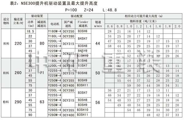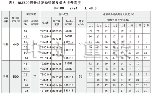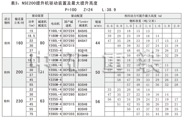 NSE系列高速板鏈斗式提升機(jī)共有九種基本型號(hào):NSE100、NSE200、NSE300、NSE400、NSE500、NSE600、NSE700、NSE800、NSE1000,每種型號(hào)根據(jù)輸送物料的不同,選擇不同的提升速度,提升速度≤70m/min,提升高度65m。另外,中礦公司還可根據(jù)用戶要求輸送量介于上述型號(hào)之間的擴(kuò)展型號(hào)。